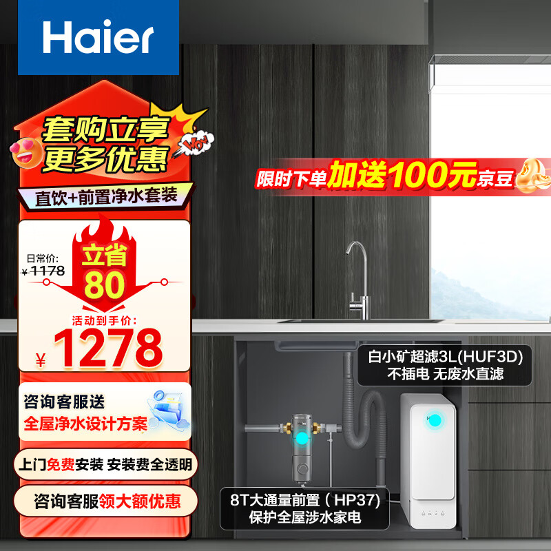 海尔(Haier)超滤净水器家用净水机直滤3L大流量饮用厨下式无桶厨房过滤器白小矿净水器+前置过滤器HUF3D+HP-37价格:1278.00元!