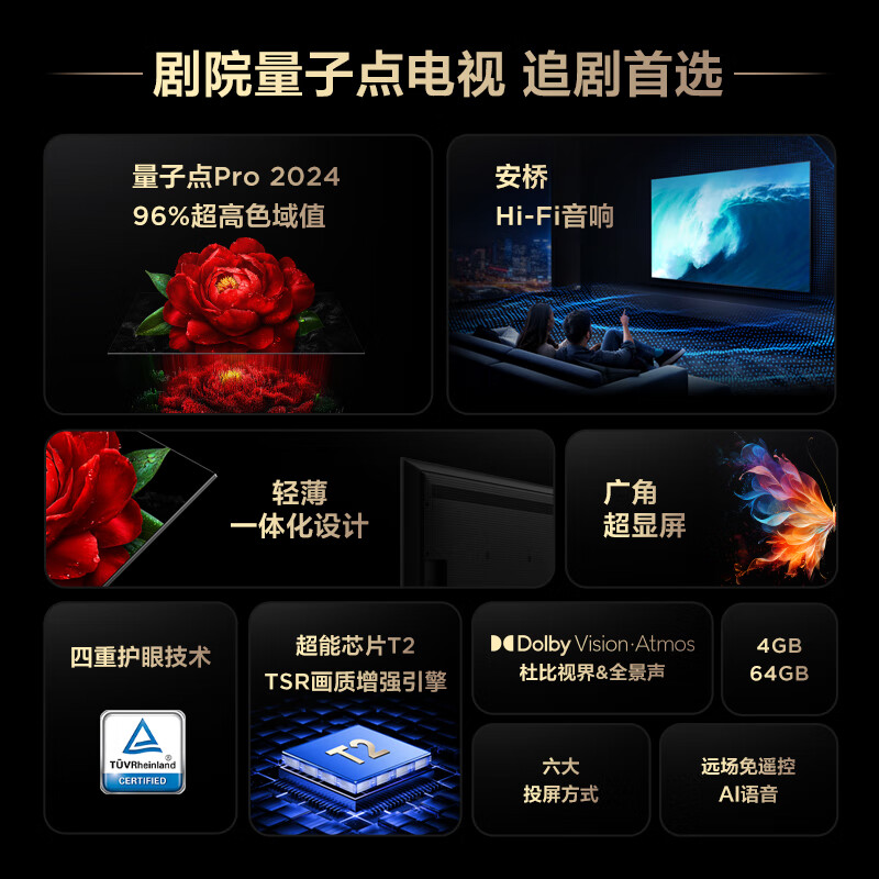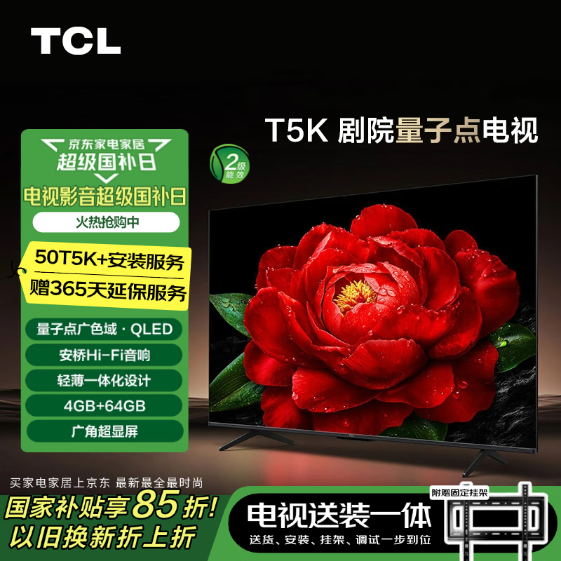 TCL 50T5K 包安装版【固定挂架送装一体】50英寸 剧院量子点电视 T5K+安装服务含挂架价格:1898.00元!