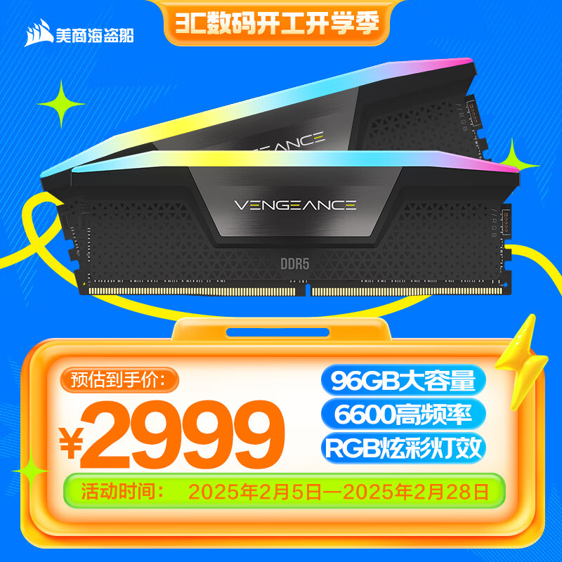 美商海盗船 (USCORSAIR) 96GB(48Gx2)套装 DDR5 6600 台式机内存条 复仇者 RGB灯条 黑色 C32价格:2999.00元!