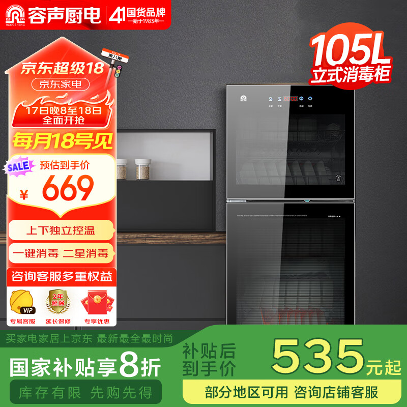 容声(RONGSHENG)消毒柜家用 立式消毒碗柜 商用 餐具茶杯碗筷厨房臭氧消毒柜105L双门大容量138-RQ230(A)价格:669.00元!