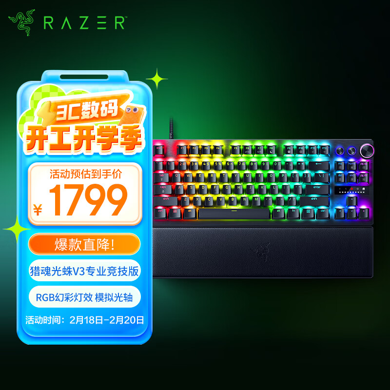 雷蛇(Razer)猎魂光蛛V3专业竞技版 模拟光轴 机械键盘 有线键盘 电竞游戏键盘 87键 RGB幻彩 黑色价格:1619.00元!