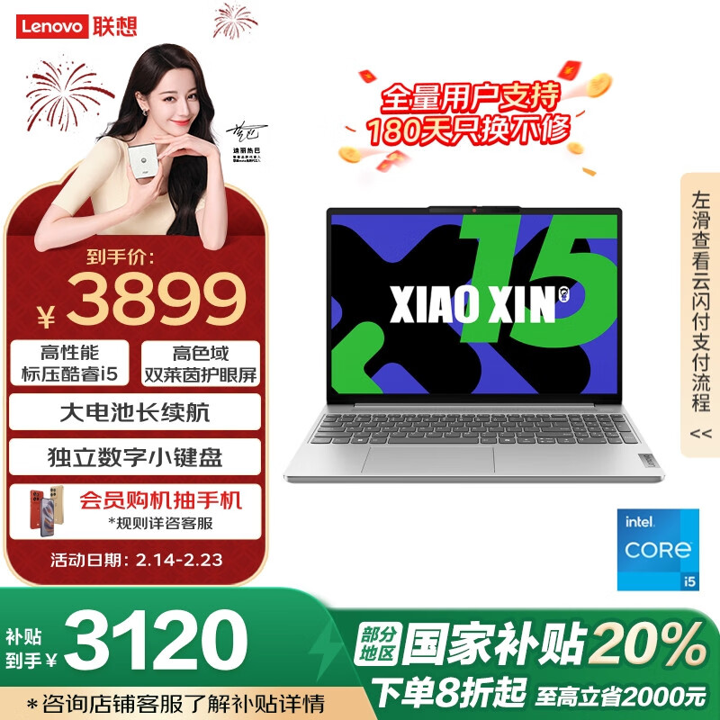 联想笔记本电脑小新15超薄本 高性能轻薄本标压酷睿i5 16G 512G 高色域护眼屏 办公 银【补贴20%】价格:3899.00元!