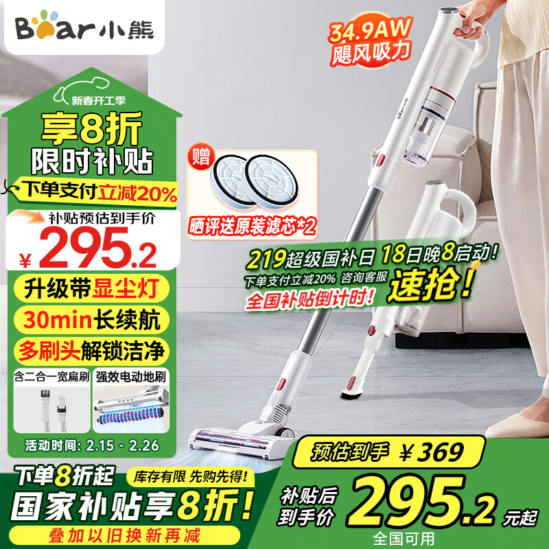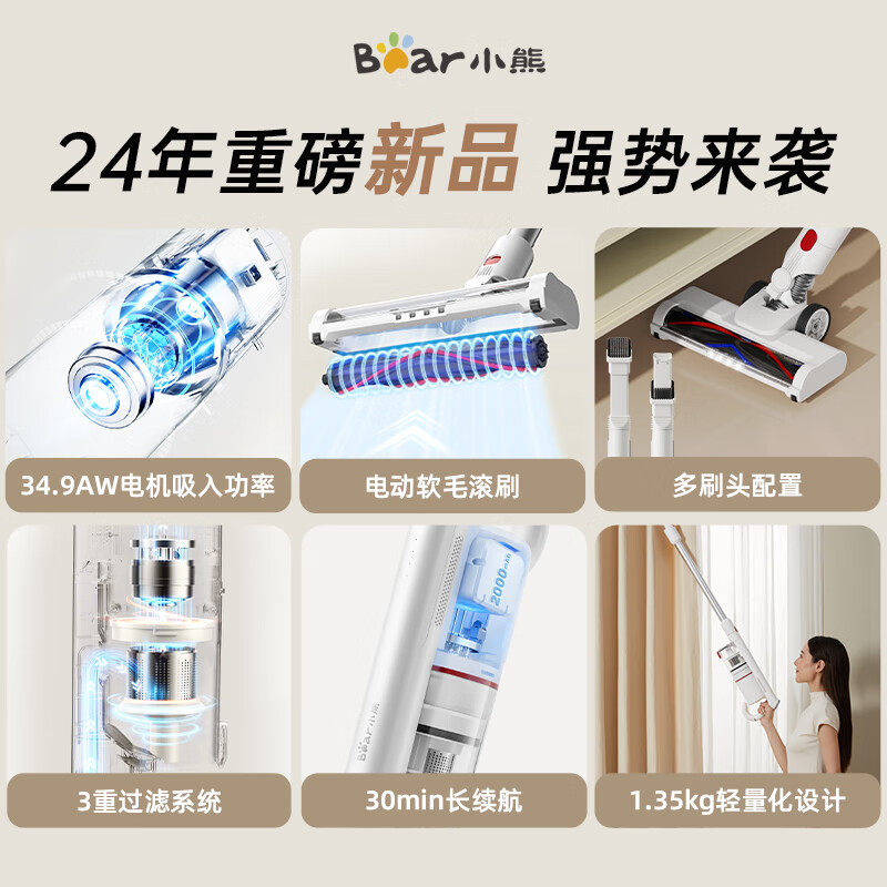 1、这次618下单了小熊的吸尘器,第二天就到货了,很棒,吸力很大,还配了刷头和扁头,功能大大提升,沙发,角落都能吸的干净,十分满意!