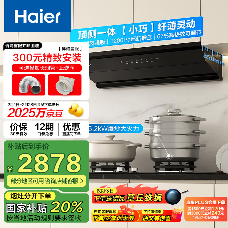 海尔(Haier)抽油烟机 【小红花】烟灶套装顶侧一体欧近一体 28方大吸力政府补贴20%油烟机 5.2kw天然气C50+BEA价格:3598.00元!