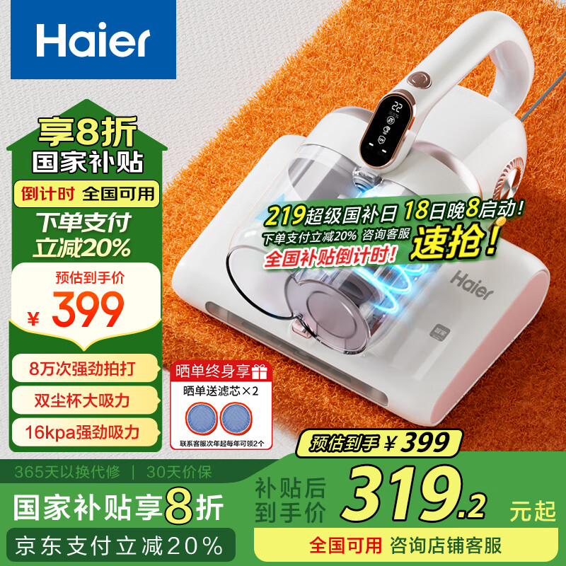 海尔【补贴】除螨仪床宝双杯尘螨分离家用床上超声波除螨虫紫外线杀菌大吸力吸尘神器8万次拍打C9W价格:399.00元!