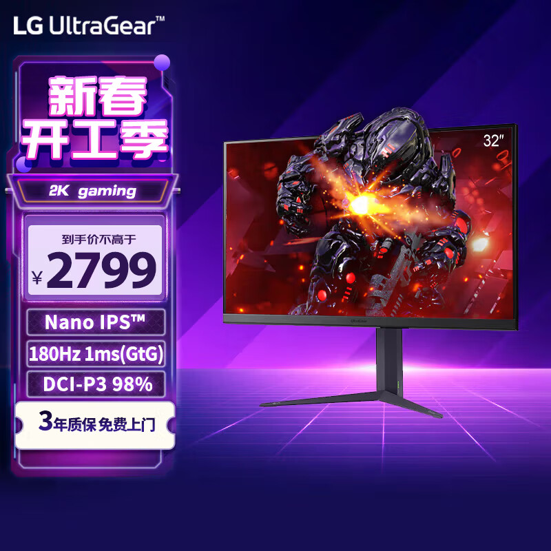 LG 31.5英寸 NanoIPS 2K显示器 180Hz原生 1ms FreeSync G-Sync 满血版 高刷游戏电竞显示屏 32GS85Q价格:2799.00元!