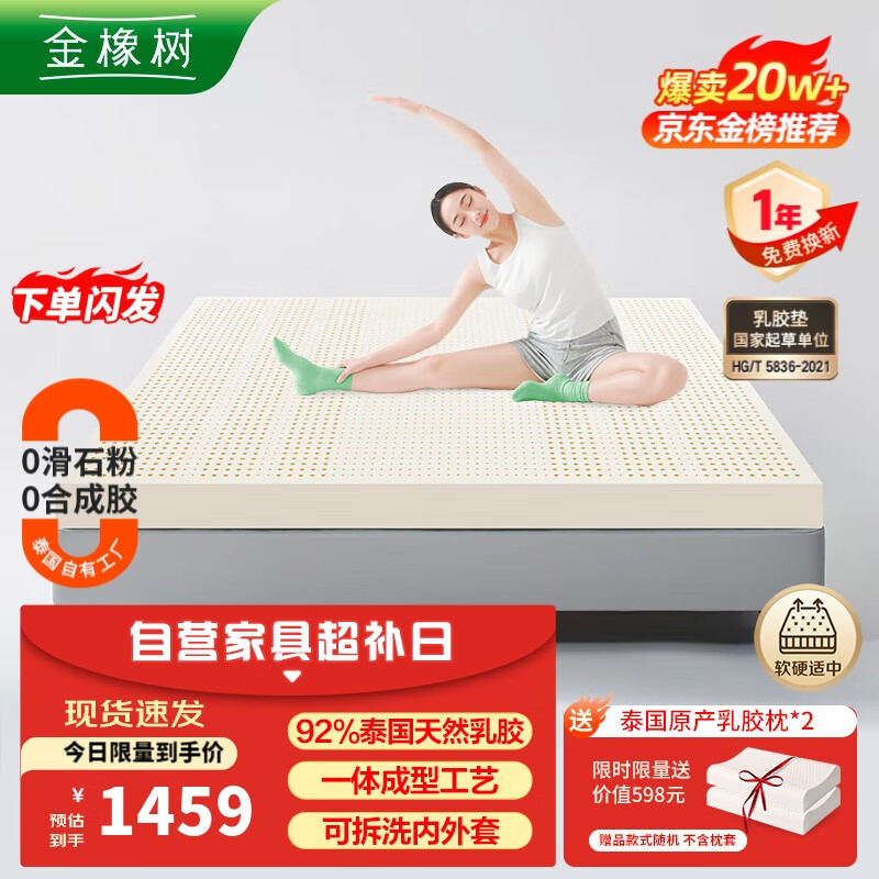 金橡树泰国乳胶原液进口床垫榻榻米加厚双人床垫 1.8*2米 泰舒 含内外套价格:1459.00元!