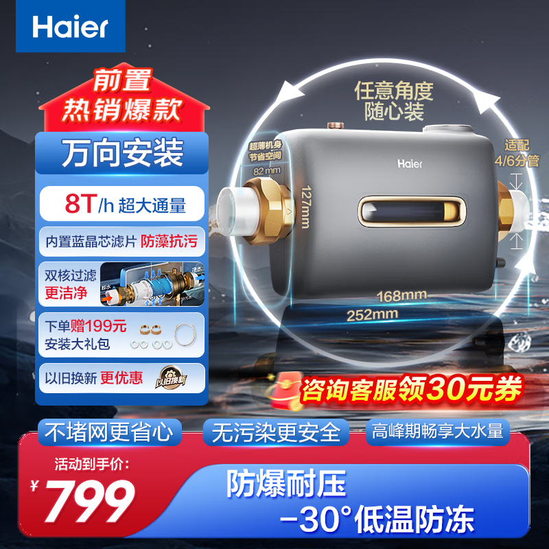 海尔(Haier)前置过滤器8T大通量净水器家用40微米双滤网过滤全屋用水任意安装不受限 小横星 HQZ60-HFAW12价格:799.00元!