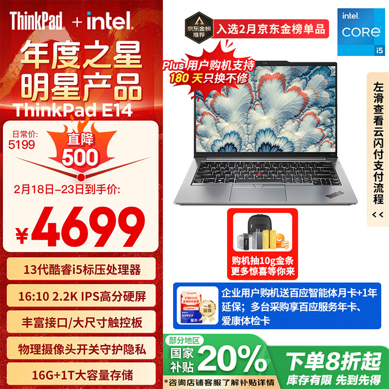 ThinkPad【补贴20%】联想E14笔记本电脑 便携商务办公学生轻薄本 酷睿i5 16G 1T 2.2K 100%sRGB 银色价格:4699.00元!