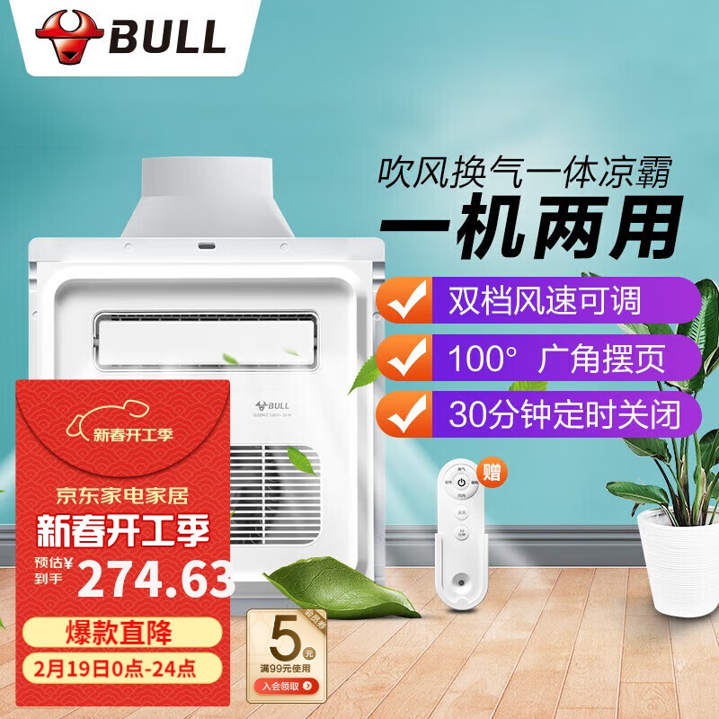 公牛(BULL)凉霸厨房卫生间GL02AYZ 【2档吹风换气 红外遥控定时关闭】价格:327.18元!