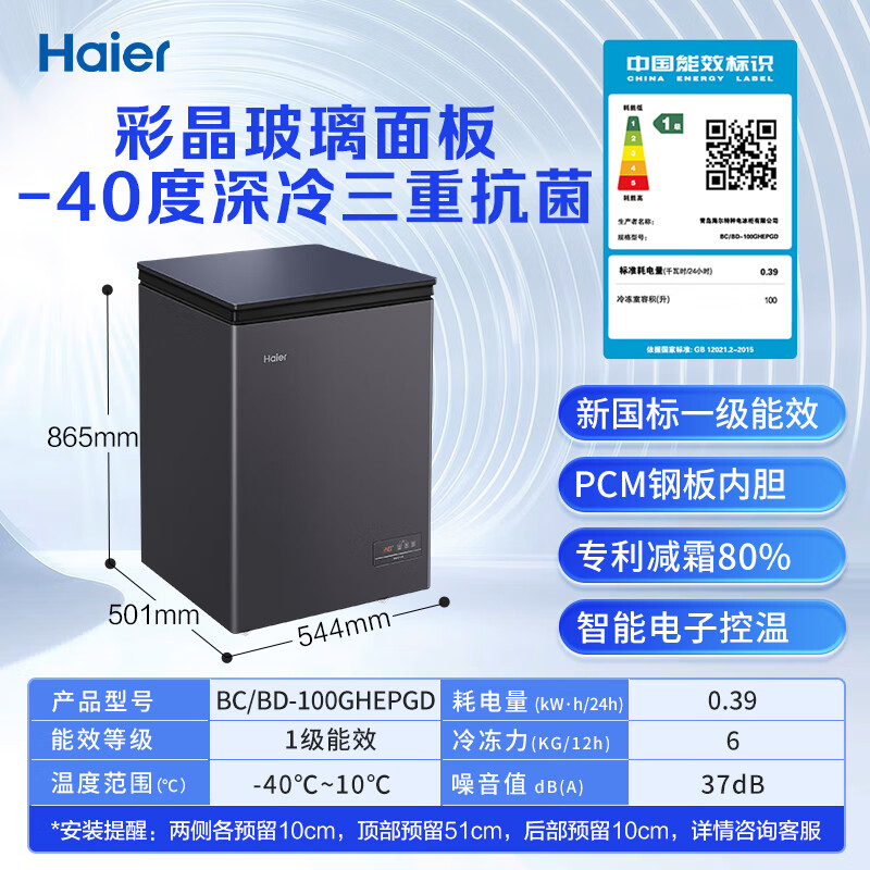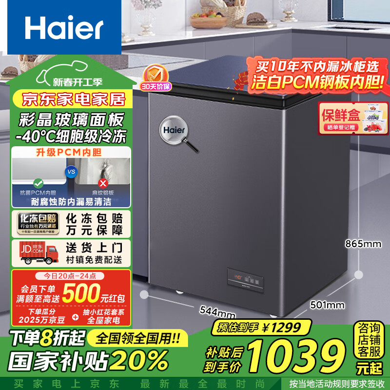 海尔(Haier)冰柜家用京东自营100升小冰箱小型冷柜-40度超低速冻智能电子温控BC/BD-100GHEPGD家电补贴20%价格:1249.00元!