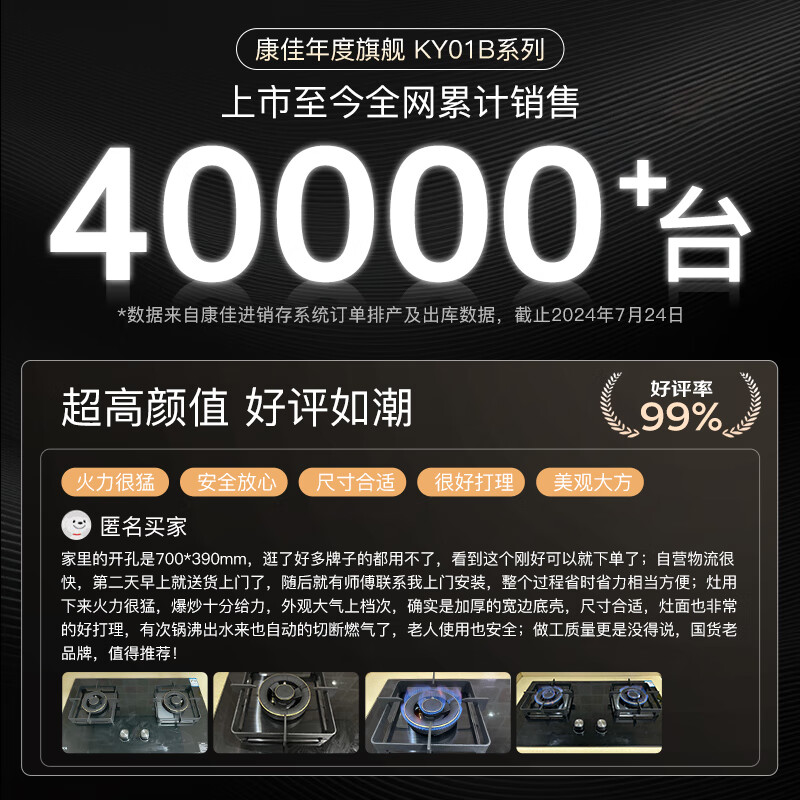 这款康佳JZT-KY01B的朋友有点多,这回就给大家介绍下,这款才出不久,特别的受欢迎,煤气灶外观方面大气颜色搭配黑色可以啊!是正品安装固定好使用效果更好啊!火苗也旺啊!价格优惠多多啊!发货速度快啊!