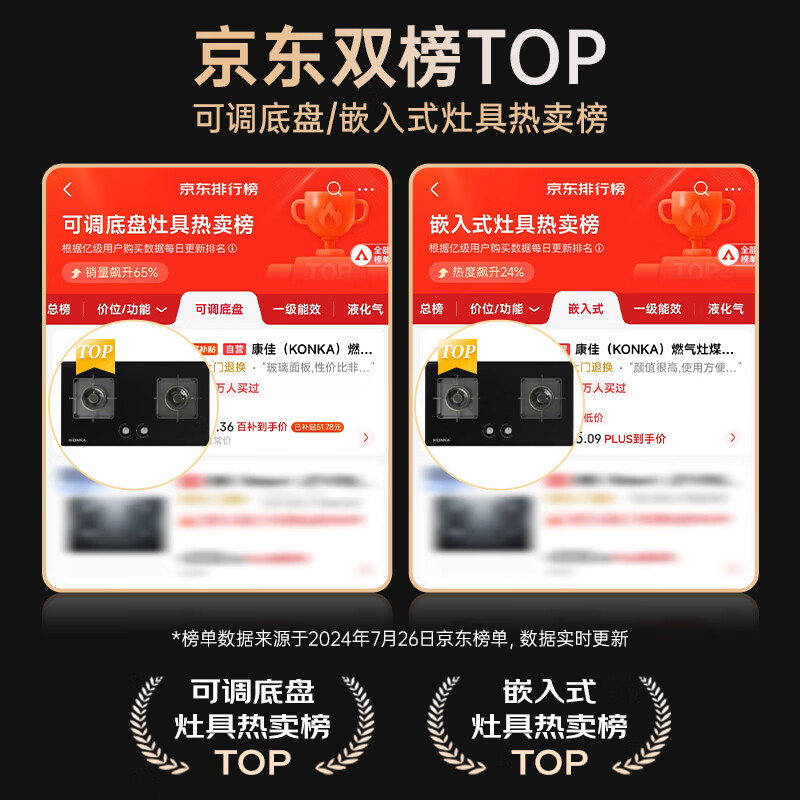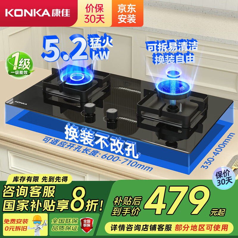 康佳(KONKA)燃气灶煤气灶双灶家用【补贴】 5.2kW可调节底盘不改孔 耐用铝炉头 JZT-KY01B(天然气)价格:598.00元!