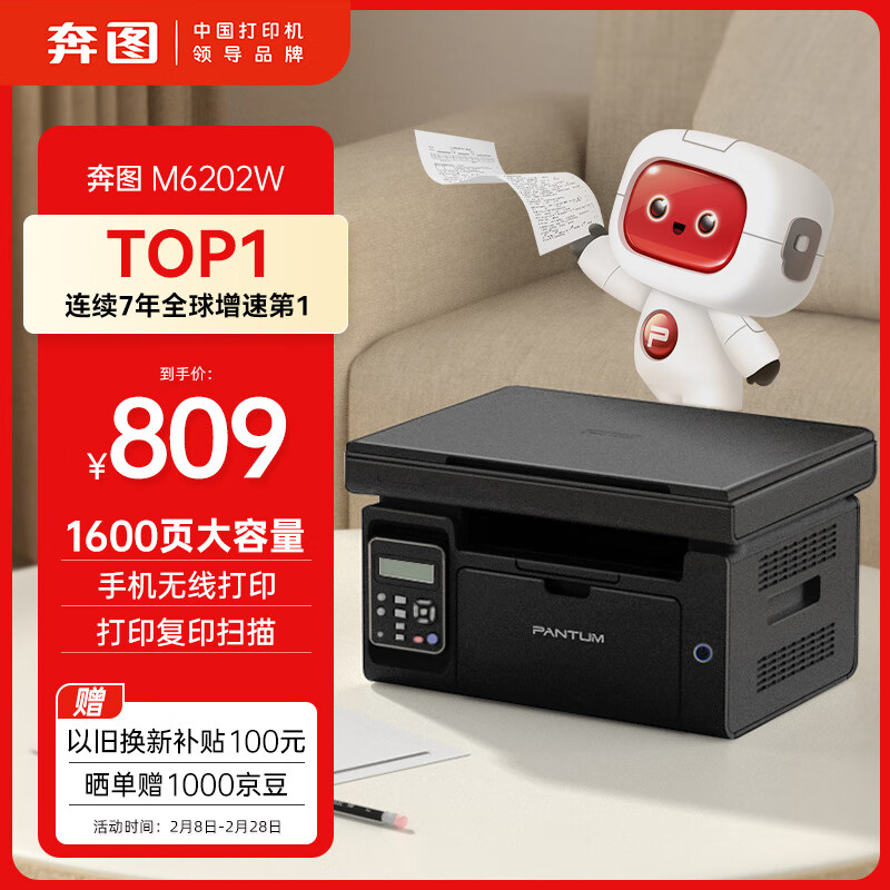 奔图(PANTUM)M6202W黑白激光打印机 家用复印扫描一体机 手机无线学习打印 静谧黑价格:809.00元!