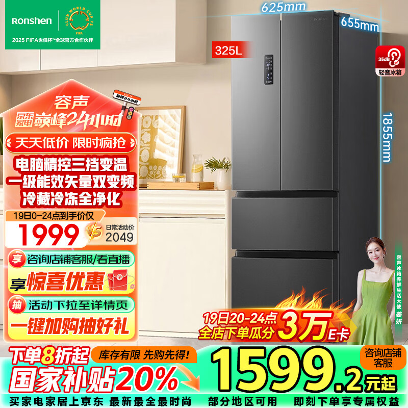 容声325升法式多门四开门电冰箱小户型家用一级能效风冷无霜变频节能超薄BCD-325WD16MP补贴20%价格:1998.99元!