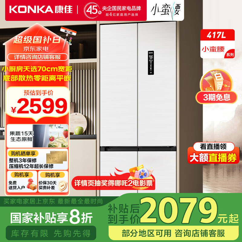 康佳小蛮腰60cm超薄零嵌入式417升70cm宽十字对开四开多门冰箱双循环一级能效底部散热家电补贴价格:2599.00元!