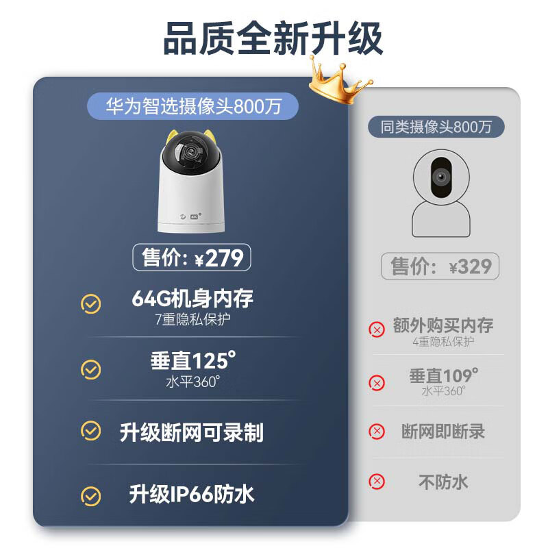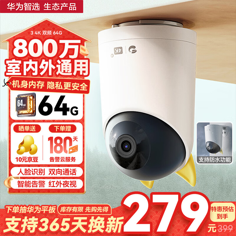 华为智选800万摄像头监控器360度无死角带夜视全景可通话 宠物母婴老人小豚当家用室内户外门口庭院海雀34K价格:279.00元!