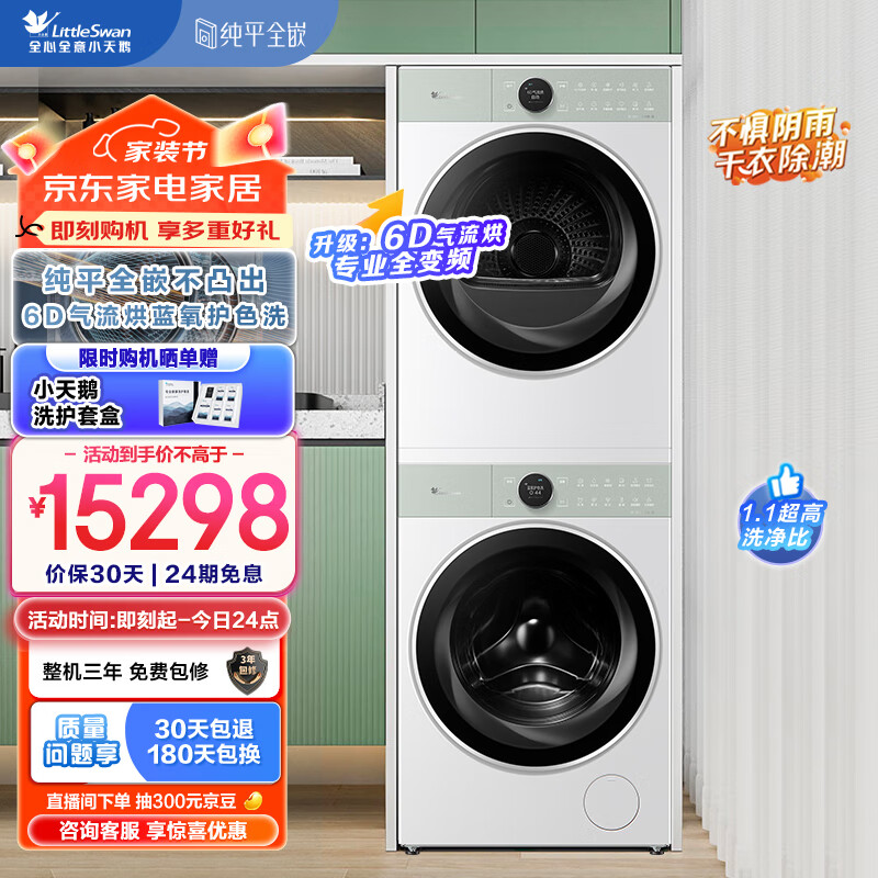 小天鹅(LittleSwan)洗烘套装 10KG滚筒洗衣机全自动+热泵烘干机家用 纯平全嵌 本色蓝氧 雨晨青TG100MS97IL-G+97W-G价格:15298.00元!