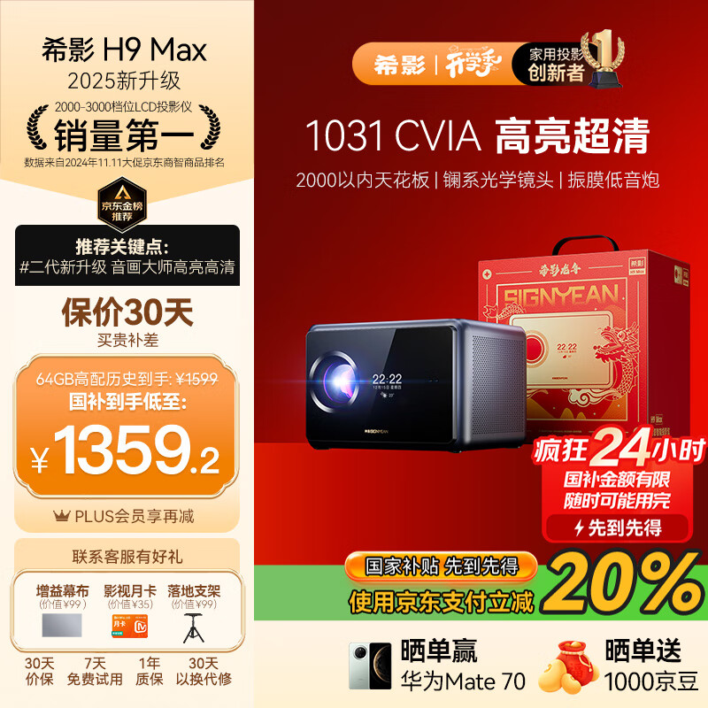 希影(Signyean)H9max 二代家用投影仪 2024龙年限定版 超高清家用卧室投影机 智能家用影院 礼盒装 1031CVIA价格:1599.00元!