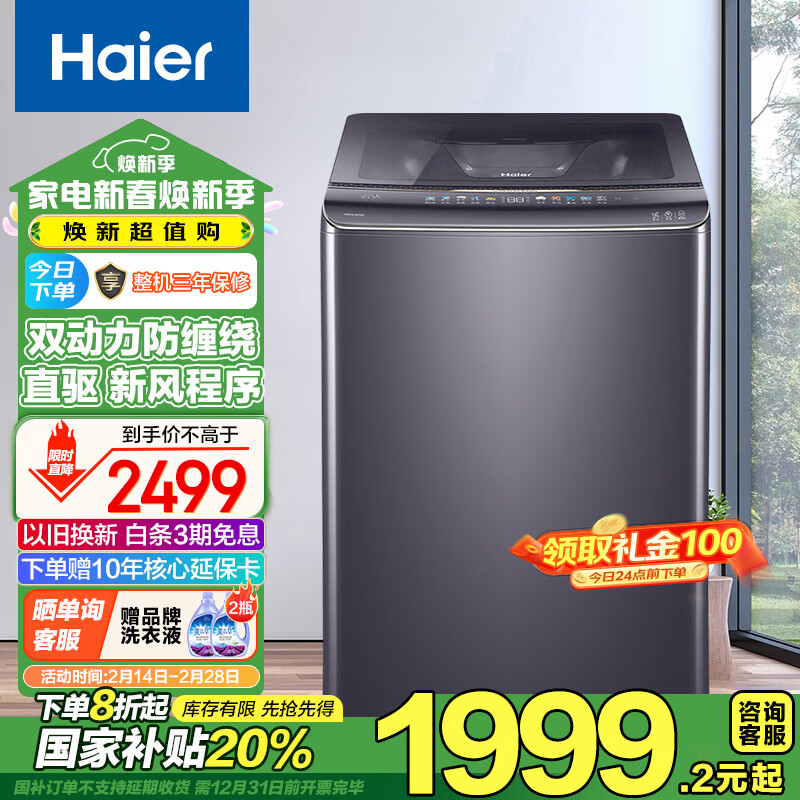 海尔(Haier)10KG双动力防缠绕洗衣机全自动波轮家用大容量直驱变频一级能效紫外线除菌+浣纱洗XQS100-BZ368T价格:2599.00元!