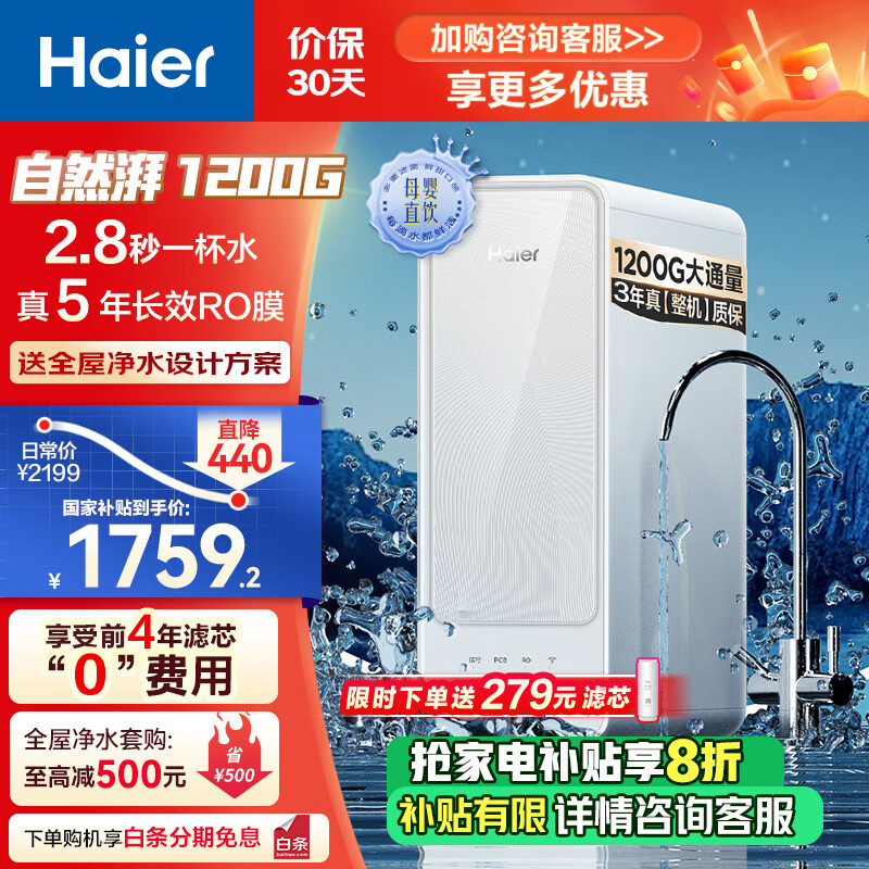 海尔(Haier)净水器家用净水机1200G大通量5年长效RO净饮机滤芯自清洗双出水厨下式过滤器 HRO12H99PRO-SU1价格:2199.00元!