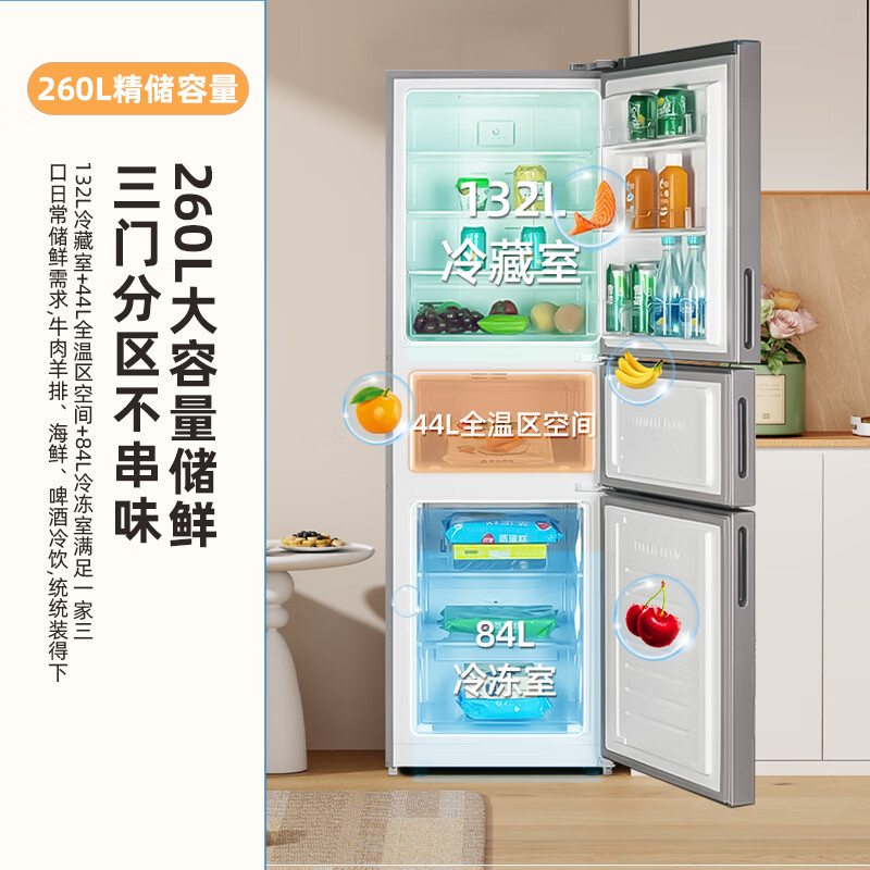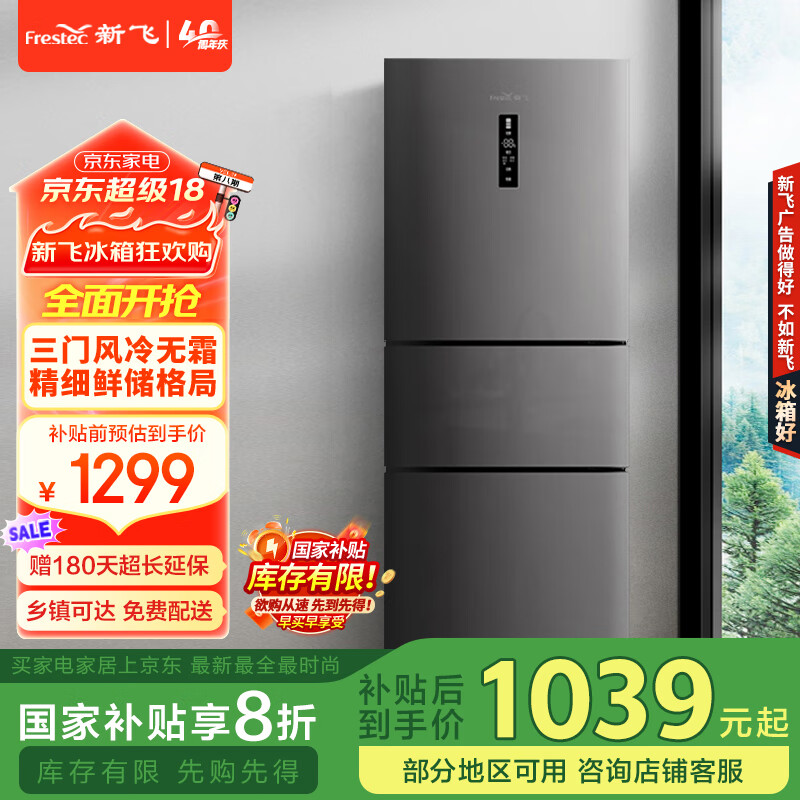 新飞(Frestec)260升变频一级能效三门冰箱中门家用风冷无霜智能变温节能补贴20% BCD-260WK3AT价格:1299.00元!