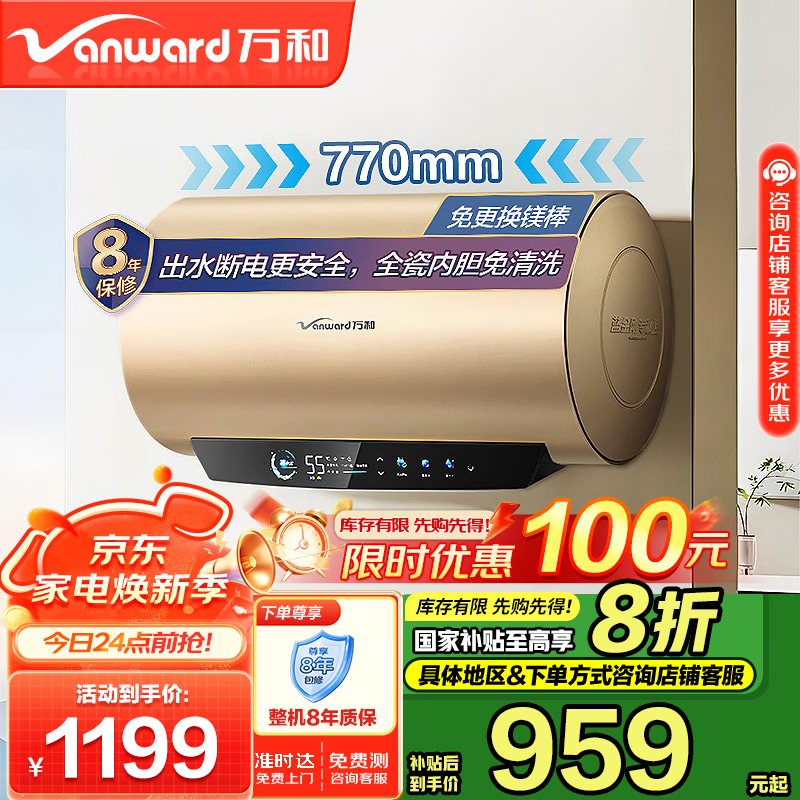 万和(Vanward)【补贴20%】全瓷内胆免清洗 80升电热水器免换镁棒 3300W速热 一级能效水电分离E80-Q8D1-30价格:1298.00元!