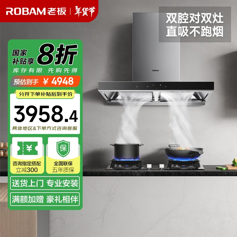 老板(Robam)抽油烟机欧式顶吸双腔变频大吸力烟灶套装家用燃气灶吸油烟机灶具套装65D3S+57B8A(天然气)价格:4803.00元!
