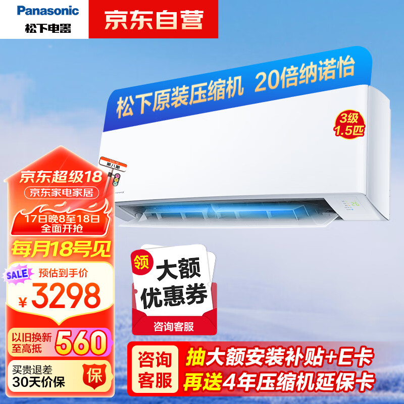 松下(Panasonic)空调滢风升级款 1.5匹 新三级能效 变频冷暖 原装压缩机 ZY35K430 以旧换新价格:3298.00元!