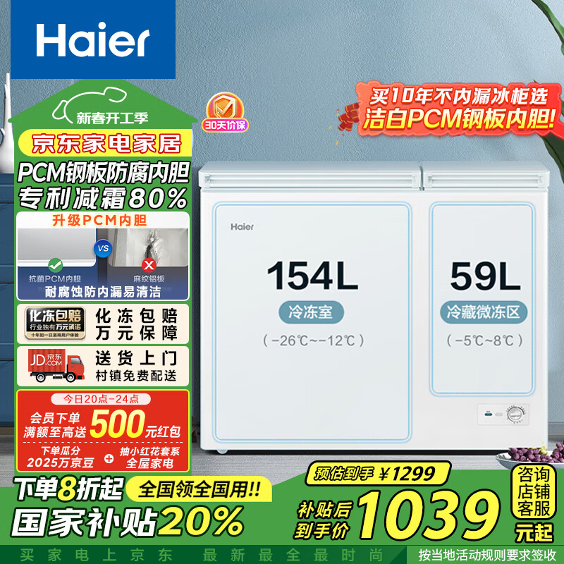 海尔213升一级能效双箱双温家用冰柜 大冷冻小冷藏卧式冰柜家用小型冰箱冷柜FCD-213GHXPD补贴价格:1299.00元!