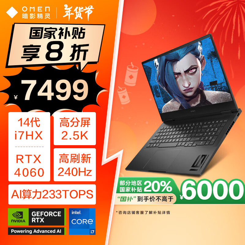 惠普(HP)暗影精灵10【补贴20%】16.1英寸游戏本 笔记本电脑(酷睿14代i7-14650HX RTX4060 16G 512GB)价格:7499.00元!