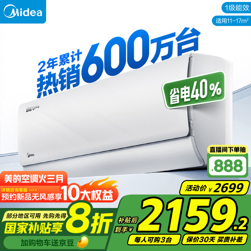 美的空调挂机大1匹酷省电pro新一级能效自清洁节能变频冷暖家电补贴20%智能卧室KFR-26GW/N8KS1-1P价格:2699.00元!