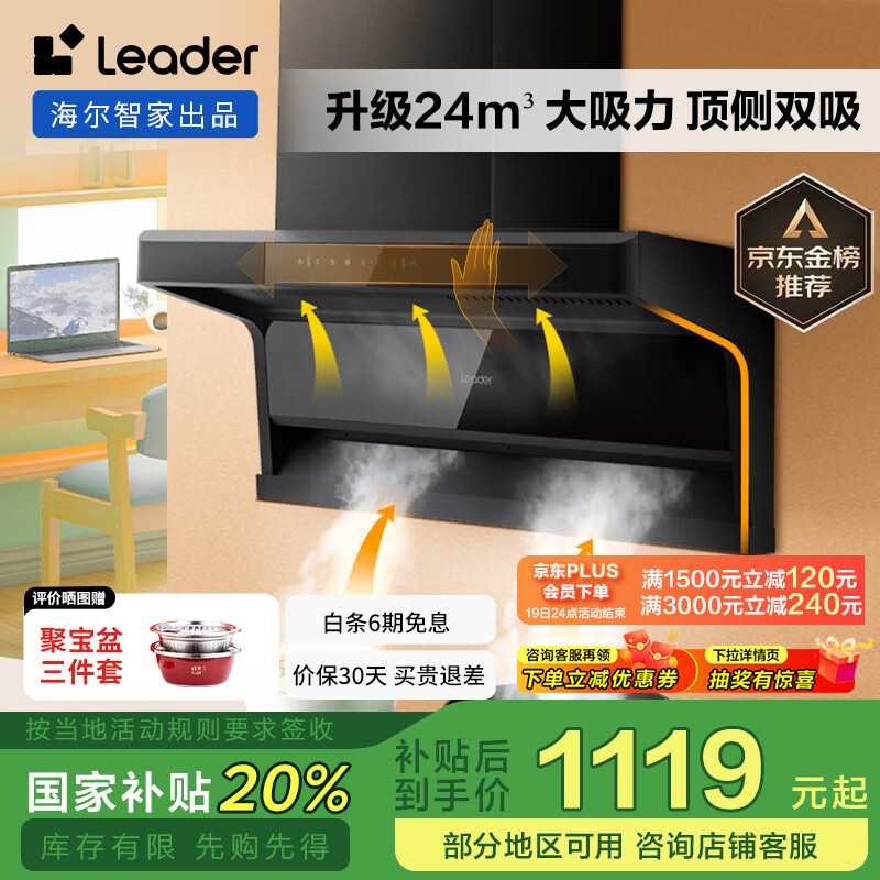 海尔(Haier)抽油烟机 顶侧双吸家用Ieader智家出品 升级24大吸力 顶侧三腔三吸自清洁 政府补贴20%油烟机IQ92D价格:1599.00元!