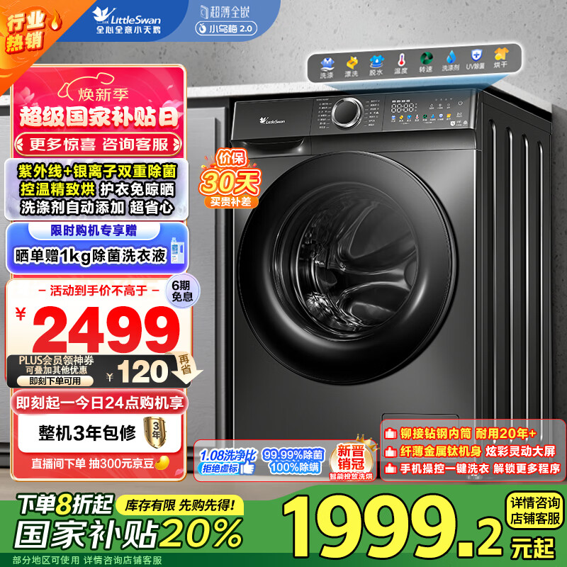 小天鹅(LittleSwan)滚筒洗衣机全自动家用 带烘干洗烘一体【TD100VT6XR17】智投 10公斤 家电补贴20% 以旧换新价格:2499.00元!