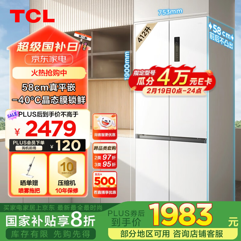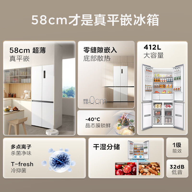 TCL 412升T7超薄平嵌十字对开四开门58cm嵌入式白色家用电冰箱风冷无霜一级能效补贴R412T7-UQ价格:2599.00元!