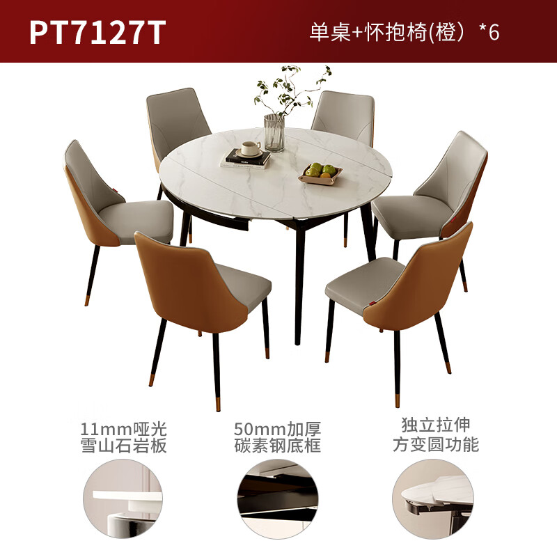 顾家家居(KUKA)现代拉伸岩板餐桌椅家用饭桌可伸缩圆桌PT7127T 餐桌+怀抱橙椅*6价格:3499.00元!