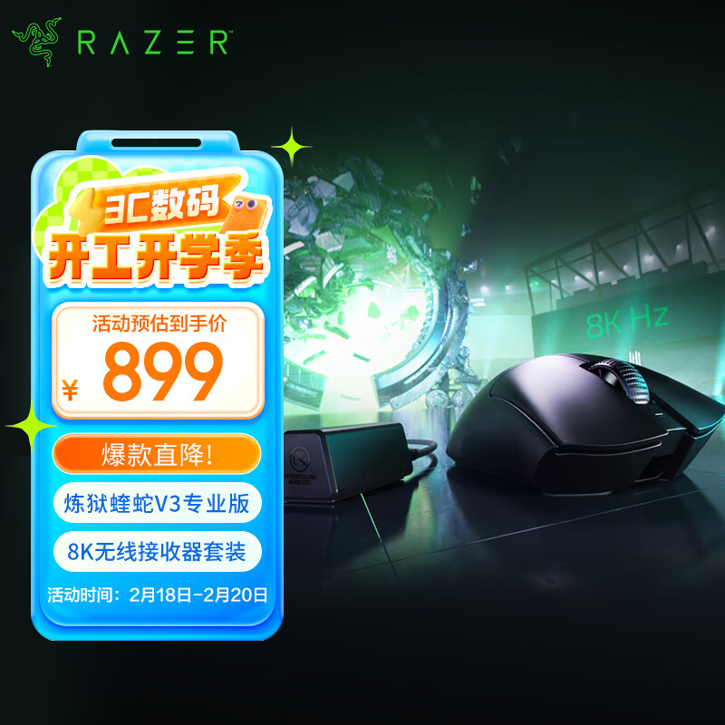 雷蛇(Razer)炼狱蝰蛇V3pro专业版 无线鼠标+8KHz轮询率接收器 无线鼠标套装 类肤材质 轻量设计 LOL吃鸡神器价格:899.00元!