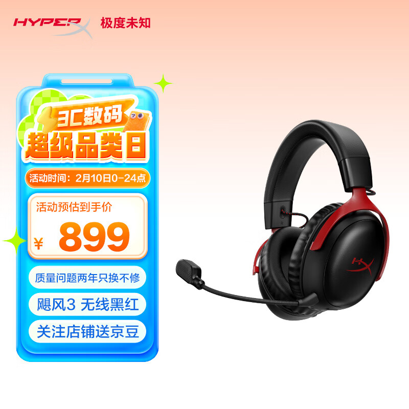 极度未知(HYPERX)【只换不修】Cloud Ⅲ Wireless 飓风3无线黑红 电竞游戏耳机头戴式 降噪麦克风 FPS吃鸡价格:899.00元!