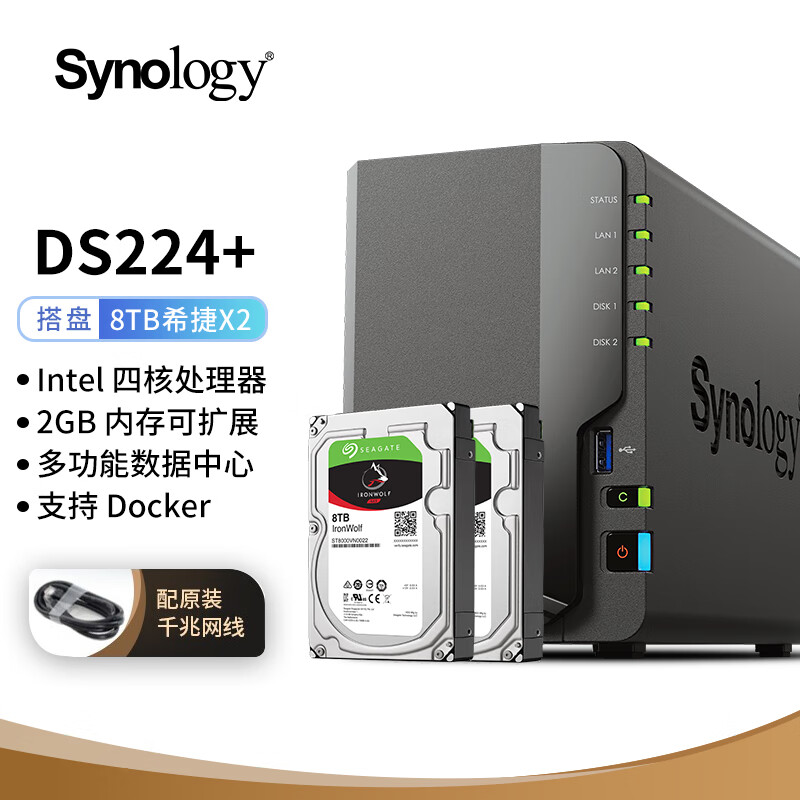 群晖(Synology)DS224+搭配2块希捷(Seagate)8TB酷狼IronWolf ST8000VN004硬盘套装价格:5687.00元!