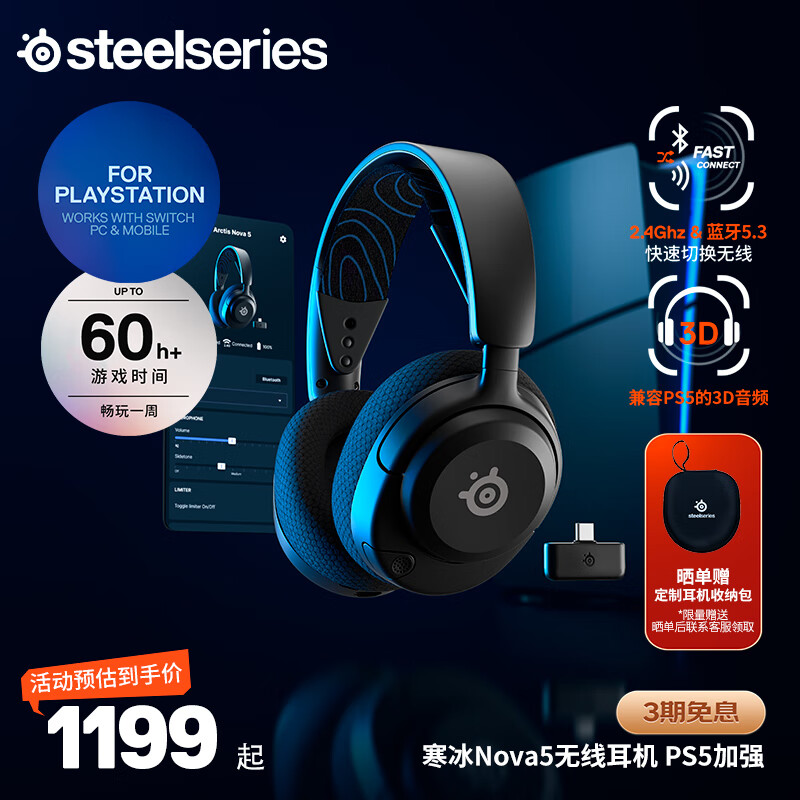 赛睿(SteelSeries)寒冰 Nova 5P蓝牙/2.4G双无线头戴式耳机笔记本台式电脑电竞游戏耳麦 FPS7.1环绕声PS5加强价格:1199.00元!