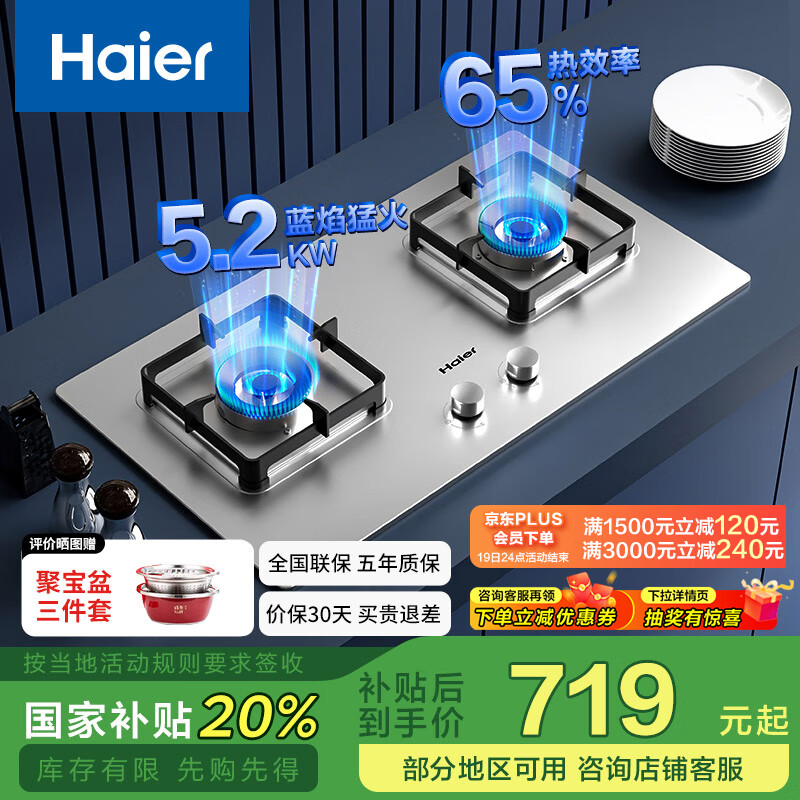 海尔(Haier)燃气灶双灶家用 天然气不锈钢灶具 5.2kw纯蓝火焰 65%热效易洁耐高温 台嵌两用JZT-Q2GE2(12T)价格:899.00元!