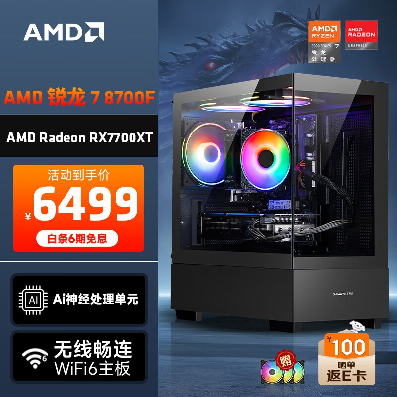 AMD龙神 锐龙R7-8700F/RX7700XT 12G/16G DDR5/1T SSD 电竞游戏设计师台式电脑主机整机价格:6999.00元!