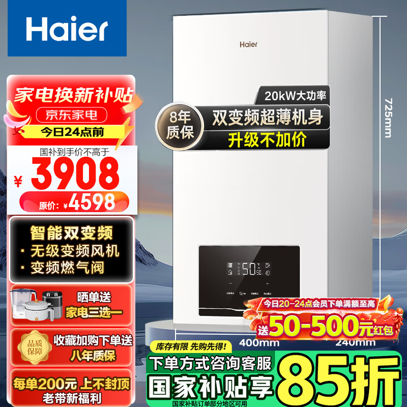 海尔(Haier)双变频燃气壁挂炉天然气板换式静音采暖炉家用地暖全屋供暖洗浴节能五点恒温以旧换新L1PB20-HJ7价格:4598.00元!
