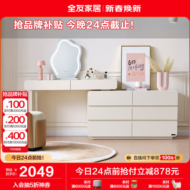 全友家居 卧室奶油风化妆桌家用伸缩梳妆台六斗柜一体转角书桌129553价格:2927.14元!