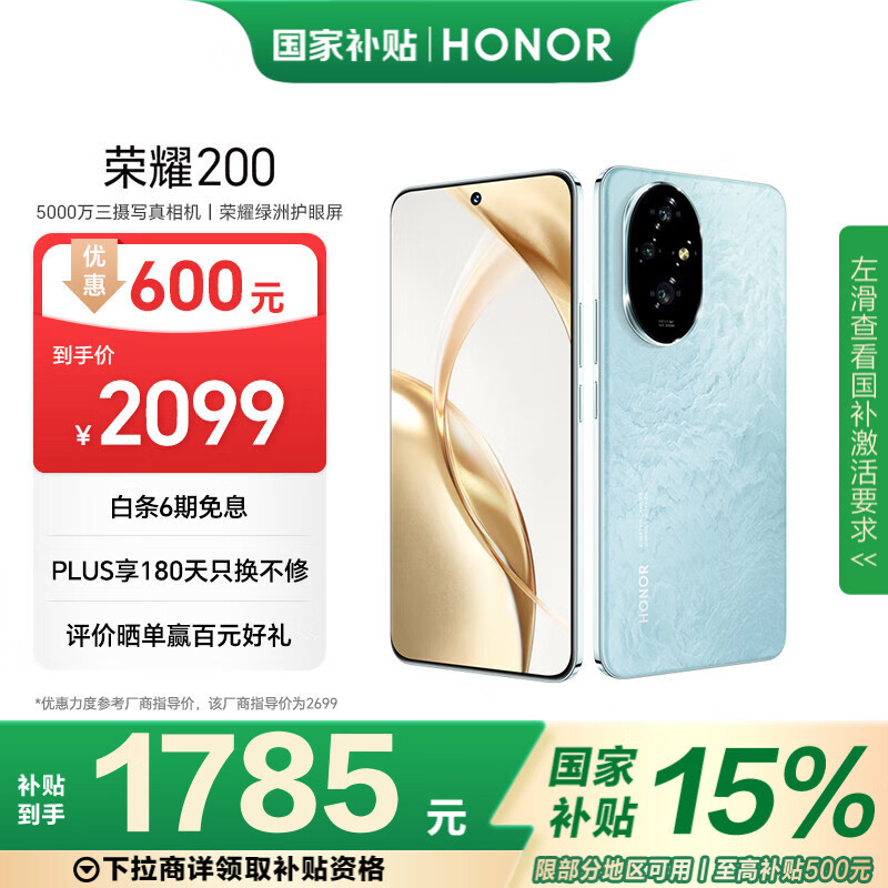 荣耀200 旗舰级青海湖电池 绿洲护眼屏 雅顾光影主摄 16+256 天海青 拍照5G AI 新款智能手机 政府补贴价格:2099.00元!