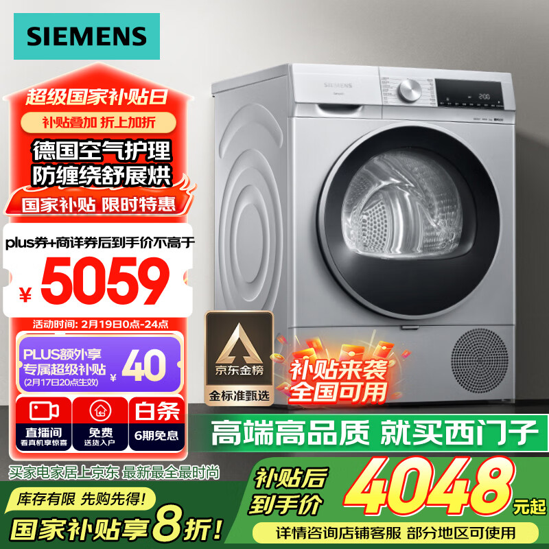 西门子(SIEMENS)iQ300 烘干机家用 10公斤热泵干衣机 除菌除螨 多维立体烘干 蚕丝柔护 羽绒烘 D80W价格:5299.00元!