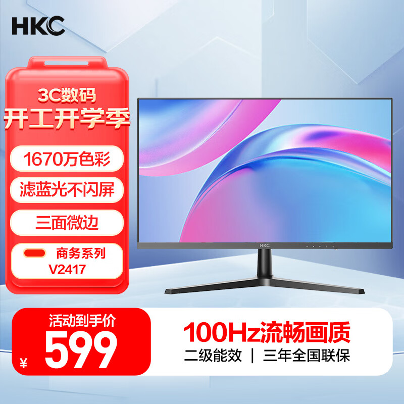 HKC 23.8英寸 IPS 100Hz刷新率 三面微边广视角滤蓝光不闪屏 商务办公设计液晶电脑屏幕显示器 V2417价格:599.00元!