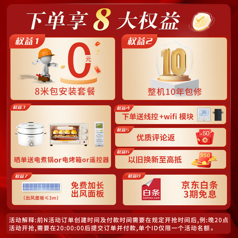 3、送货及时,安装师傅们很认真仔细的安装,空调质保10年放心,其他品牌是6年,铜管8米够长没有增加,无高空作业费,包打孔,好评!(期待装修完成后二次调试后使用效果来追评)