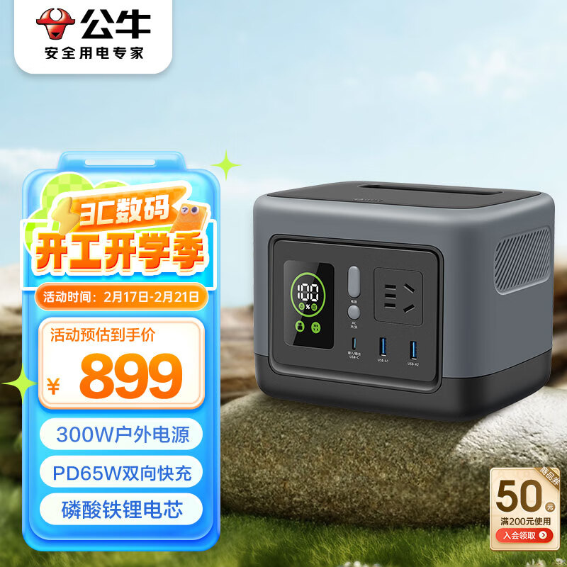 公牛【3C认证】300W户外电源 便携PD65W双向快充 220v充电宝 72000mAh大容量停电应急露营备用移动电源价格:899.00元!