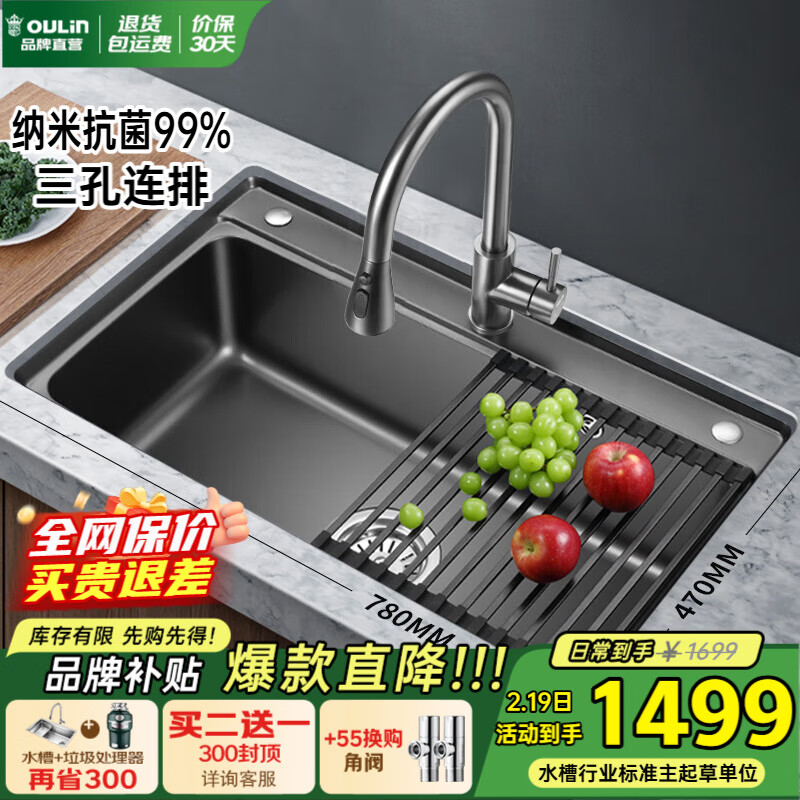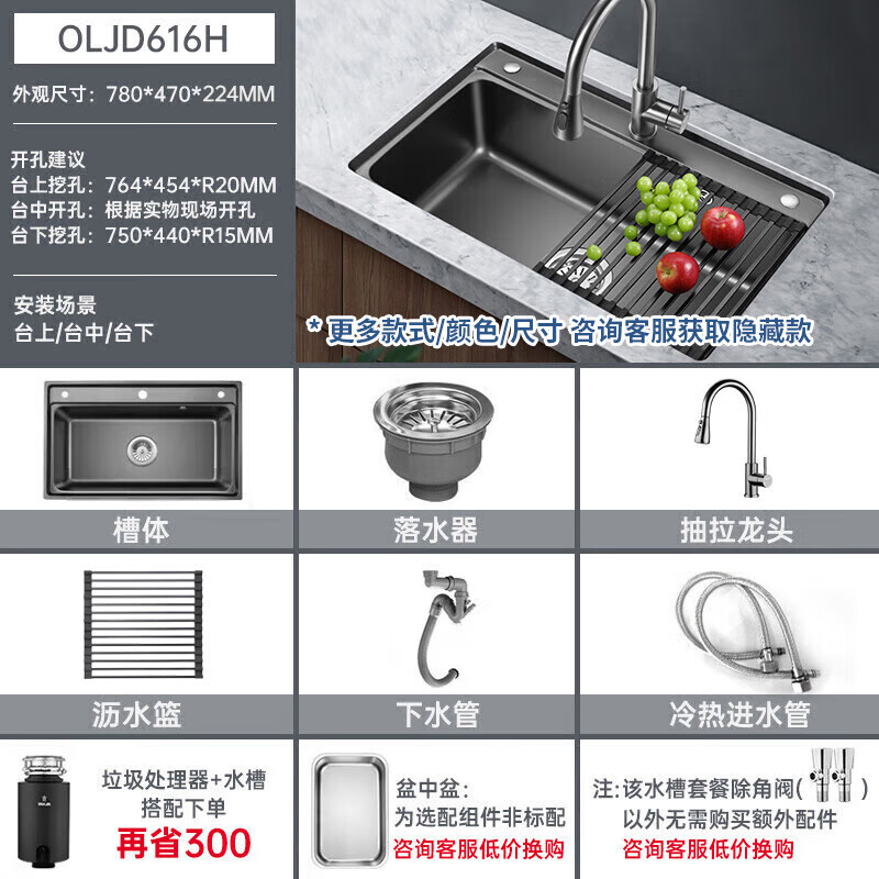 欧琳(OULIN)厨房水槽大单槽台下盆 洗菜盆一体盆纳米水槽304不锈钢大单槽616H价格:1699.00元!